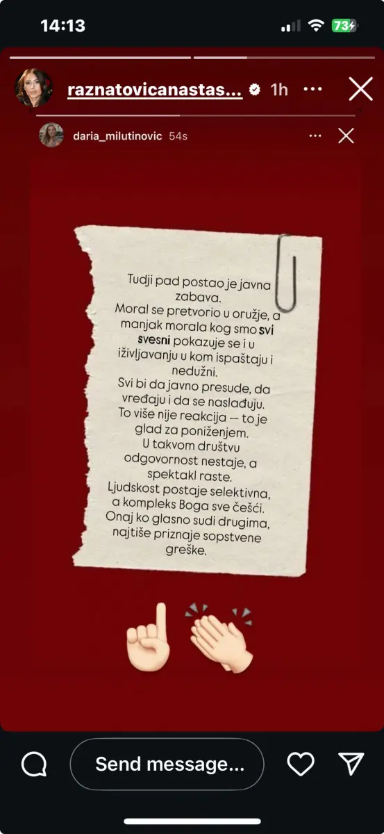 Objava Anastasije Gudelj na Instagramu, u kojoj je podelila citat Darie Milutinović, izazvala je veliku pažnju i podstakla razmišljanje o savremenom društvu i načinu na koji ono reaguje na tuđe greške. Iako se u samom citatu ne pominje konkretno ime, trenutak u kojem je objava nastala – dok je privatni život Vujadina Savića bio u centru pažnje – mnoge je naveo na zaključak da pevačicina poruka ima dublje značenje.