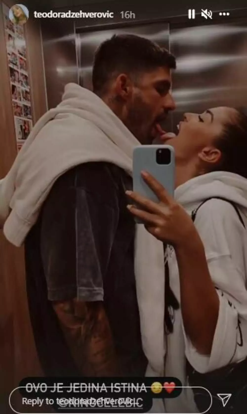 Ovo je jedina istina – napisala je Teodora uz srce i objavila jednu od ranije nastalih slika s Ninom, na kojoj se ljube u liftu.